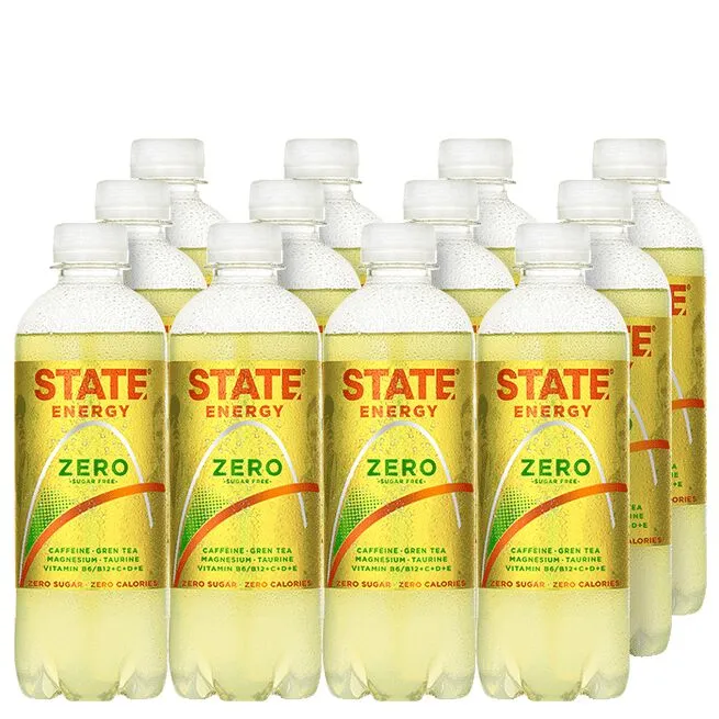 State Energy er en lækker energidrik baseret på kulsyreholdigt, naturligt kildevand i kombination med naturlige smagsstoffer. I stedet for at bruge sødestoffer eller rent hvidt sukker bruger STATE isomaltulose, også kendt som palatinos, i en velafbalanceret mængde. Dette kombineres med 160 mg koffein pr. pakke samt niacin, vitamin B5, B6 og B12.