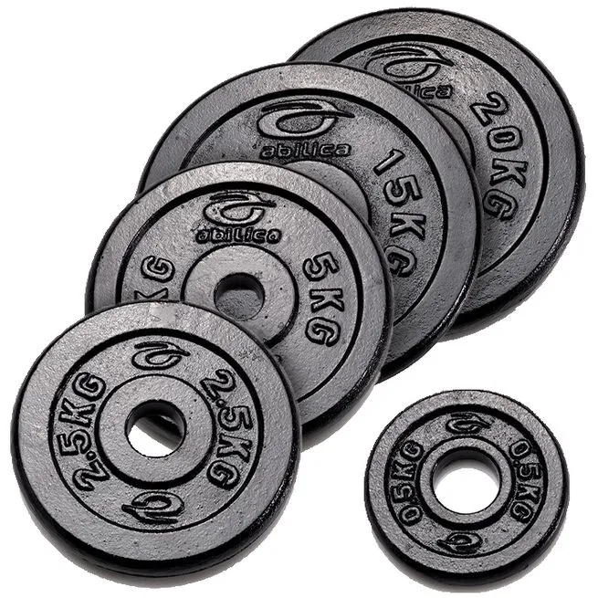 Vægtskiver i støbt jern fra Abilica til vægtstænger der er 25 mm i diameter. Vægtskiverne findes i syv forskellige størrelser, fra 0,5 kg til 20 kg.