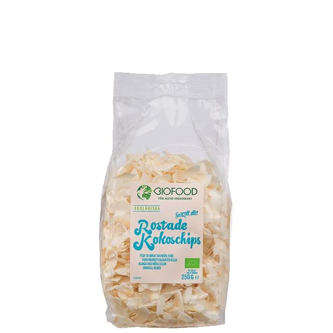 Biofoods økologiske kokosflager er fremstillet i en sprød chips størrelse og har en mild, sød smag. Skiverne kommer fra kokosnødens kød, som skives, tørres og ristes let.