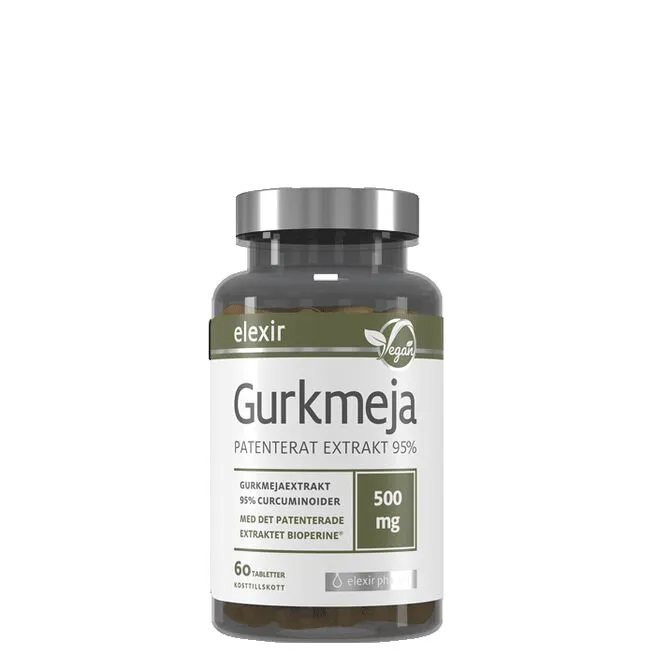Elexir Gurkmeja fra Elexir Pharma er kapsler med et gurkemejeekstrakt, hvoraf 95% er curcuminoider, som er nyttige for din krop. Kosttilskuddet indeholder endvidere Bioperion® (sort peberekstrakt), som øger optagelsen af gurkemejeekstraktet.