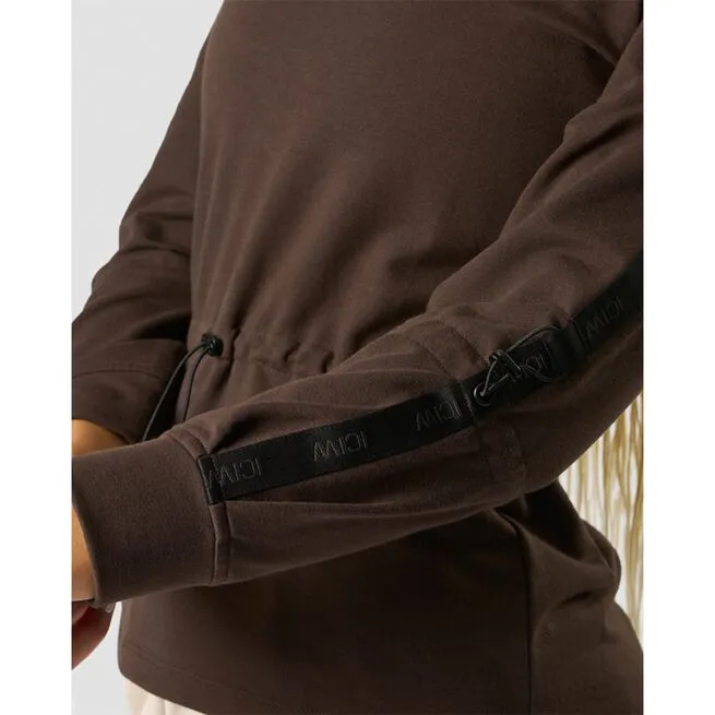 Vyötäröllä kiristysnyöri, joka antaa muotoa, avoin olkapää-leikkaus (cold shoulders) ja kiristysnyöriyksityiskohdat hihoissa.